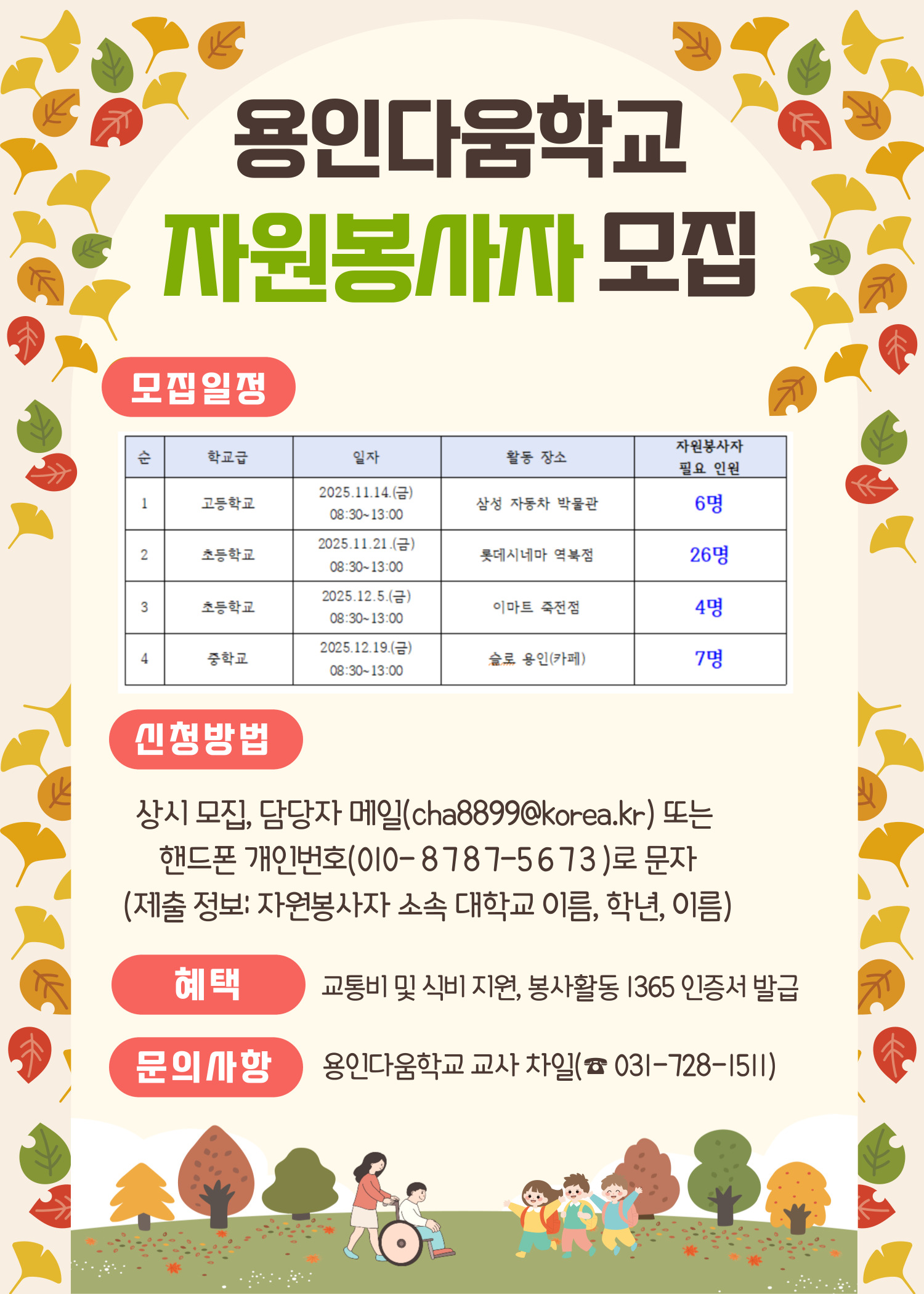 용인다움학교는 공립 특수학교로 학생들의 교육활동 및 현장체험학습, 진로직업체험과 일상생활등의 효율적인 교육활동을 위해 노력하고 있습니다. 학생들의 안전한 외부 체험과 교육활동을 위하여 특수교육 전공 대학생들을 대상으로 자원봉사자를 모집하오니 많은 관심 부탁드립니다.