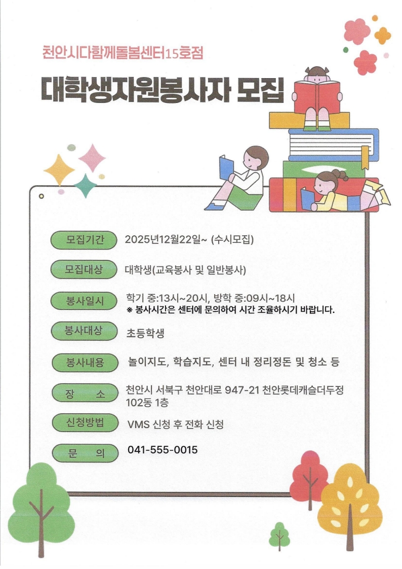 [천안시다함께돌봄센터15호점] 대학생자원봉사자 수시모집